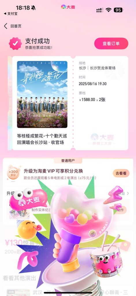 周一,老婆说她那个同事,周末去(种地)南京演唱会了,狂给她发照片。那哪能只让老婆看照片啊,于是我提议,啥时候我们也去一个,刚好,长沙,收官,说去就去,门票预约起来,8月16号的演唱会,8月6日18:18开票。